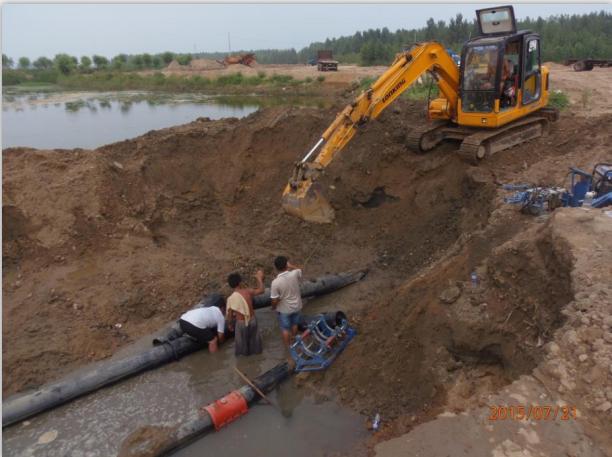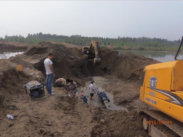 首先调用两台大型挖掘机,在管道破裂处挖出作业坑。由于该漏水点正处于泗河主河道边缘,均为深达4米的泥沙层,地质情况非常复杂,给施工带来了较大困难,经过6个小时的挖掘,受损管道才完全暴露出来。通过现场勘查,管道因受河道堆积沙石重力挤压,造成的管道下沉导致环形断裂。抢修人员冒着炎热的天气,没有片刻的休息,对破裂处进行专业的修复,经过十余小时的全力奋战,完成抢修工作,恢复了正常供水。