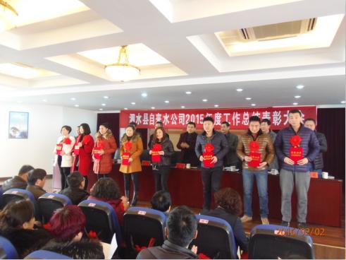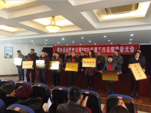 2月2日,县自来水公司召开了2015年度工作总结表彰大会,公司全体干部职工参加,住建局副局长张伟出席会议,会议由公司副经理徐艳坤主持。会上,依次对在2015年度中工作业绩突出的先进科室和先进个人进行了表彰,对先进科室和先进个人代表进行上台颁奖,科室代表及先进个人代表进行了表态发言。