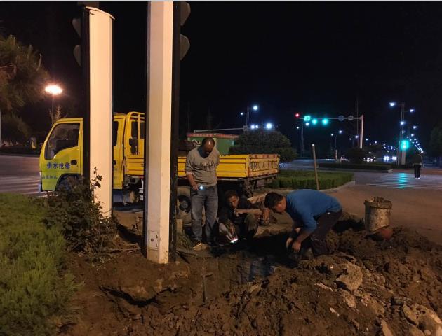 由于管道破裂点地处城区居民密集处,停水时间过长,会给附近居民生活带来不便。公司抽调维修骨干人员,组织施工机械、发电机及排水设备等进入施工现场开展抢修工作。因漏水点位于十字路口,也是供水主管道的交汇处,且管径较大、离地面深,加上大量的漏水和管内存水成了抢修难点。抢修人员克服种种不利条件,紧张有序地进行抢修作业。天慢慢的黑了下来,为尽快恢复供水,维修人员披星戴月,经过十多个小时的奋力抢修,终于在晚九时圆满地完成抢修任务。
