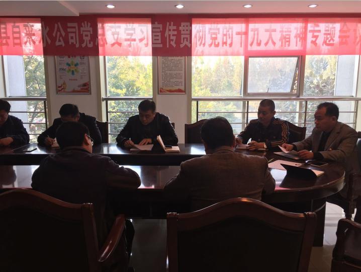 11月9日上午,自来水公司组织全体党员在二楼党员活动室召开了“学习宣传贯彻党的十九大精神”的专题会议,会议由公司党总支书记、经理王彬同志主持,党总支副书记苏东同志向与会人员传达了党的十九大和十九届一中全会精神。