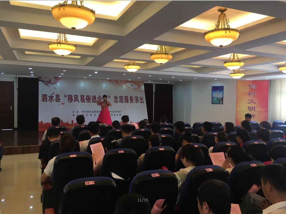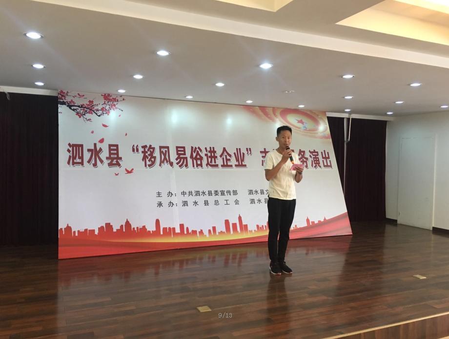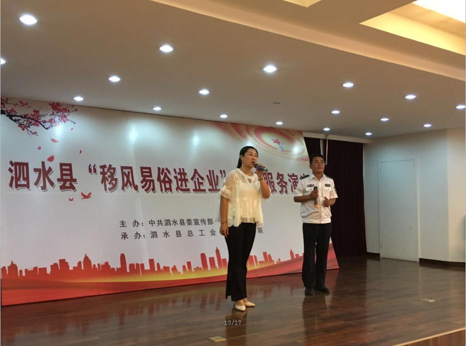6月8日,由县委宣传部、县文明办主办,县工会、县文联承办的泗水县“移风易俗进企业”志愿服务文艺汇演走进县自来水公司,下午三时在公司四楼大会议室举行,公司干部职工80余人观看了演出。