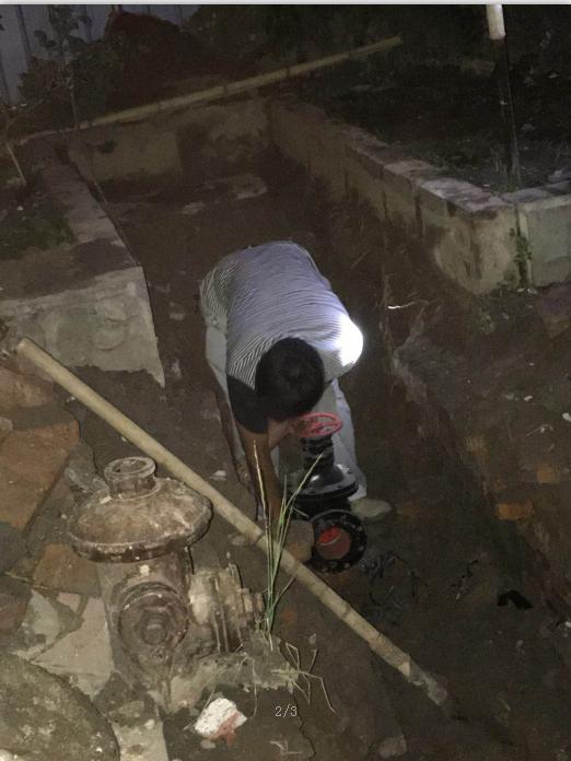 接到报修电话后,维修人员迅速赶到现场,根据现场情况,制定抢修方案。首先关闭管道阀门,防止自来水浪费;同时,维修工具、抢修车辆、围挡等抢修物质有序进入施工现场。抢修人员用抽水机将积水抽出,用挖掘机开挖查找漏水点,形成了宽1米、深1.5米的作业坑。由于因管道损坏的地方特殊,施工困难,抢修人员蹲在作业坑内进行割管、连接、上螺丝等维修工作。目前正是夏季用水的高峰时节,为使对居民用水影响降到最低,抢修人员顾不上休息,蹲的腿都麻了,衣服也被汗水浸透,经过6个多小时连夜艰苦奋战,直至凌晨,管道修复完毕,抢修工作圆满完成,恢复附近正常供水。