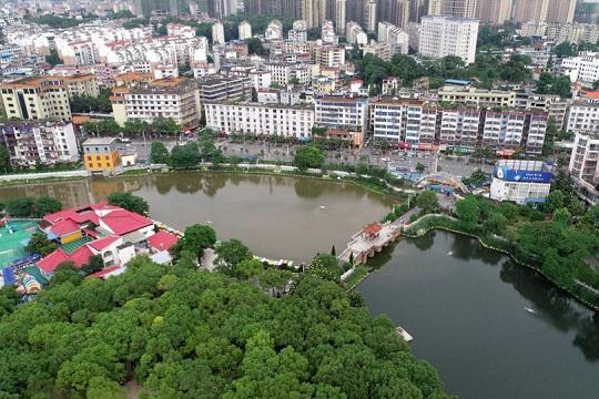 这是江西省萍乡市鹅湖公园。鹅湖公园地处萍乡市市中心,经过改造后,公园内铺设了海绵城市地砖,大大小小的池塘成为城市天然蓄水池,通过系统调控,可以随时蓄水排水。
