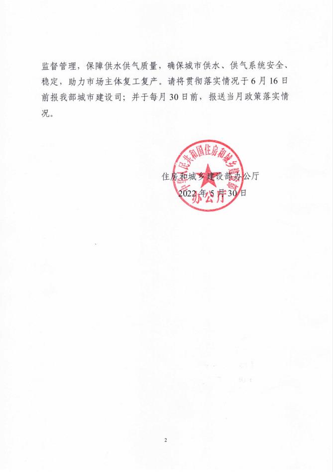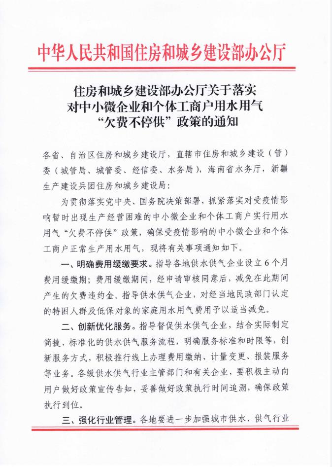 住房和城乡建设部办公厅关于落实对中小微企业和个体工商户用水用气“欠费不停供”改策的通知