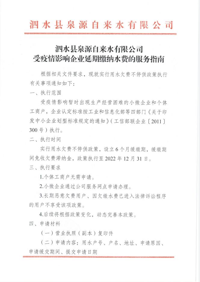 泗水县泉源自来水有限公司受疫情影响企业延期缴纳水费的服务指南