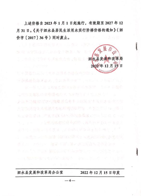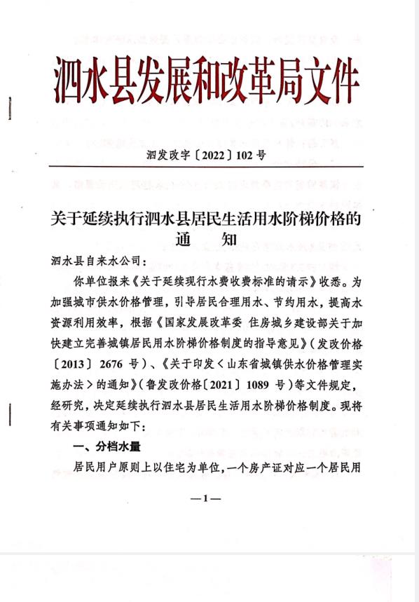 价格收费-水费收费依据《关于延续执行泗水县居民生活用水阶梯价格的通知》